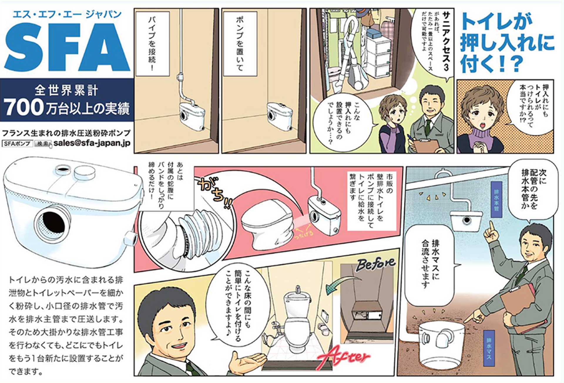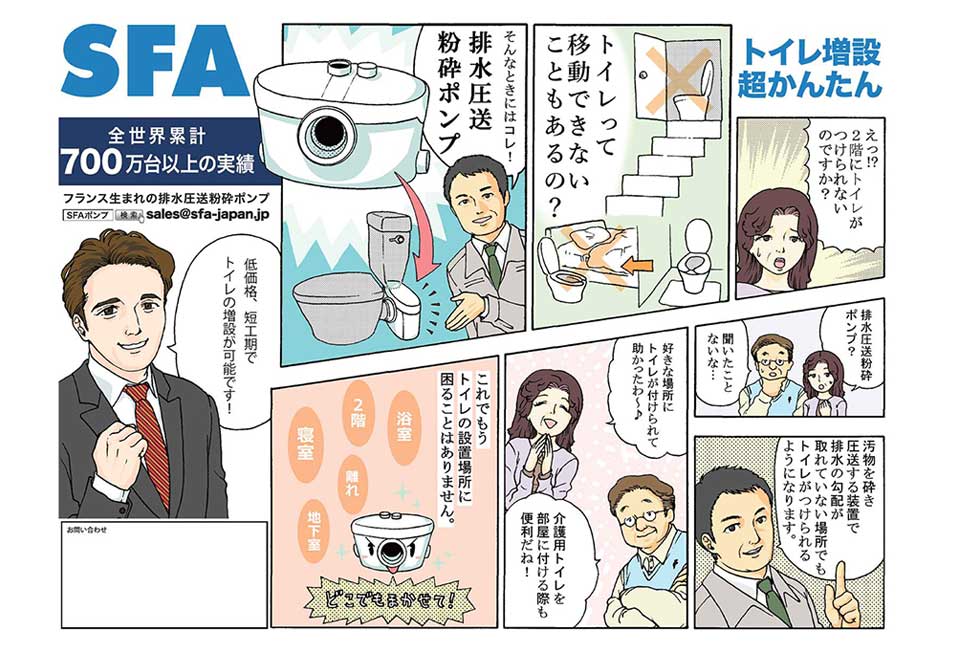 SFAは60年の歴史を持ち、フランスに本社を置く世界シェアNo.1のポンプメーカー。グローバルな市場においての長年の経験から日本でも安心して使える水廻り設備を提供しています。