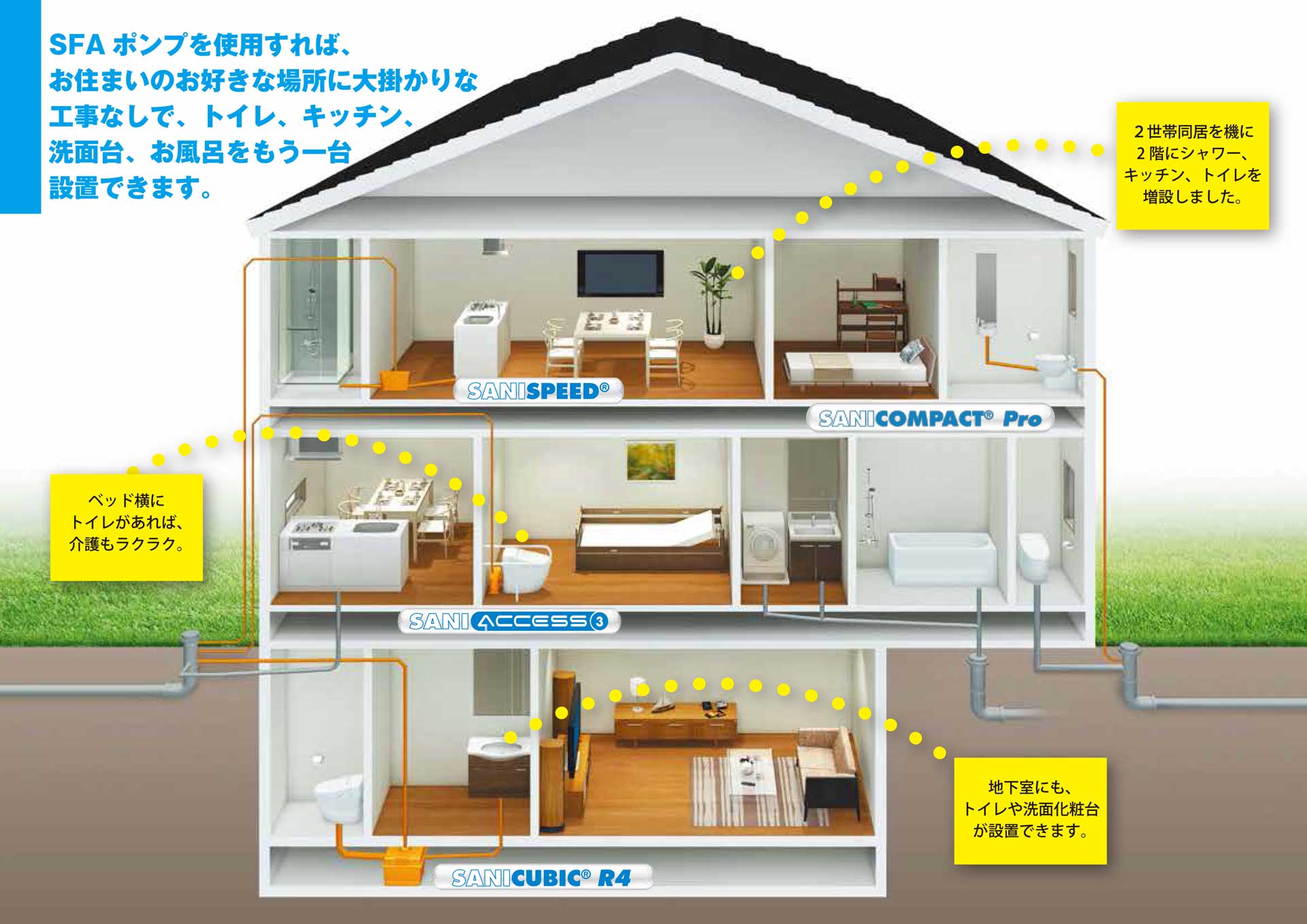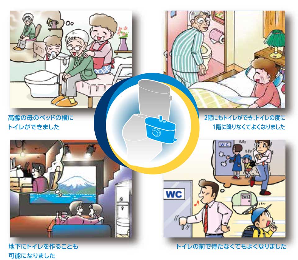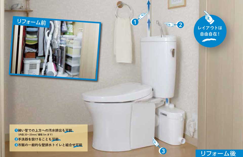 SFAポンプがあれば、配管の勾配が取れない場所でも水廻り設備を設置可能。住まいのどこにでも、トイレ・洗面台・キッチンなどを大がかりな工事をすることなく簡単に設置することができます。